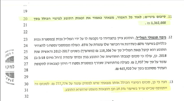 במסגרת פסק הדין נפסקו לטובת הלקוח פיצויים בסך של 1,362,000 ש"ח, בקיזוז תגמולי המל"ל, ובתוספת שכ"ט עו"ד והוצאות משפט.