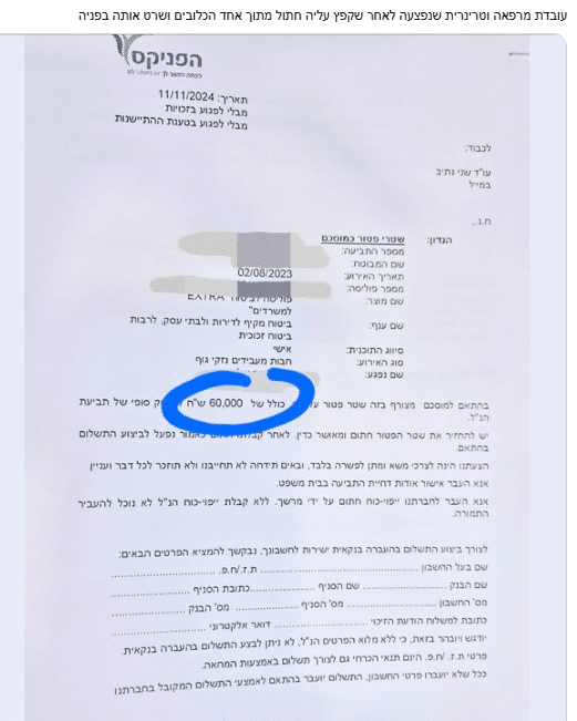 לאחר מו"מ שנוהל ע"י צוות המשרד חברת הביטוח הסכימה לשלם ללקוחה פיצויים בסך של 60,000 ש"ח.